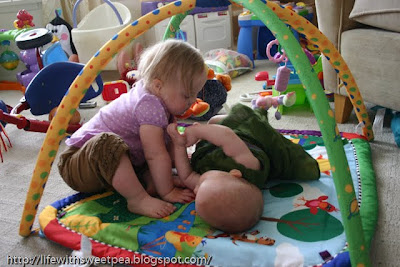 Angel greets us every time she wakes up in the morning and pretty much every nap time with a huge smile. She laughs when you laugh and loves zerberts on her belly. She loves to be roughly loved by her big sister even though it makes Mommy nervous. Sweet Pea loves to climb on top of Angel and give a full body hug. I always expect Angel to start crying, but it never fails that Angel has a huge smile on her face as I peel Sweet Pea off of her. Crazy little girl! It's true love between those two though!